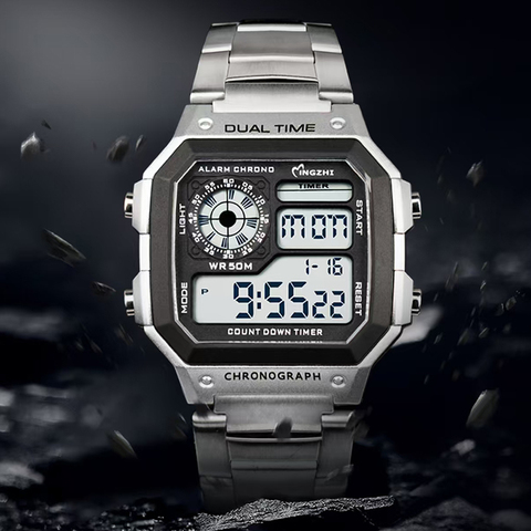Reloj Digital Deportivo de Moda para Hombre, Resistente al Agua, Cronógrafo Multifuncional, Característica Luminosa, Caja Rectangular, Correa de Acero Inoxidable